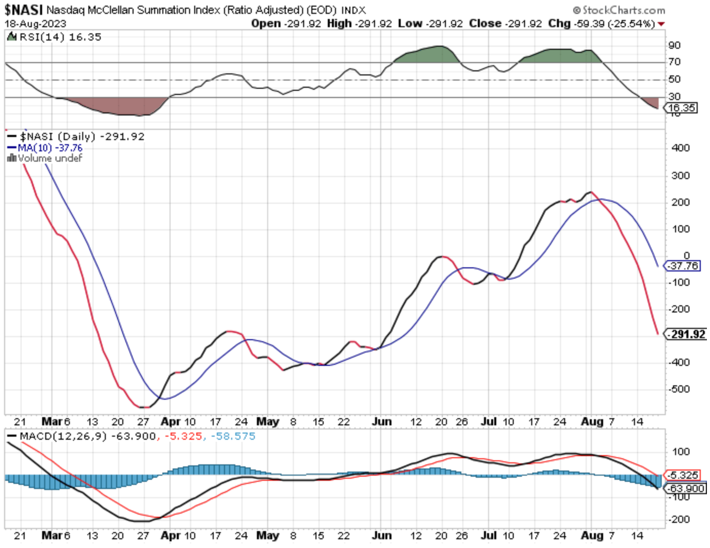 Looking at the NASI, I am not seeing signs of a turn just yet. Of course that can change quickly but just like how we waited for a MACD and RSI turn at the top in late July, we wait to see the turn here.