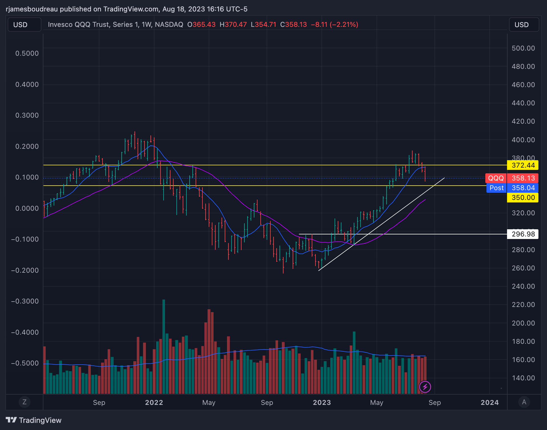 QQQ lost 2.21%. This could very well find support at 350 which could coincide with the trend line and close to the 30 week moving average (purple line).