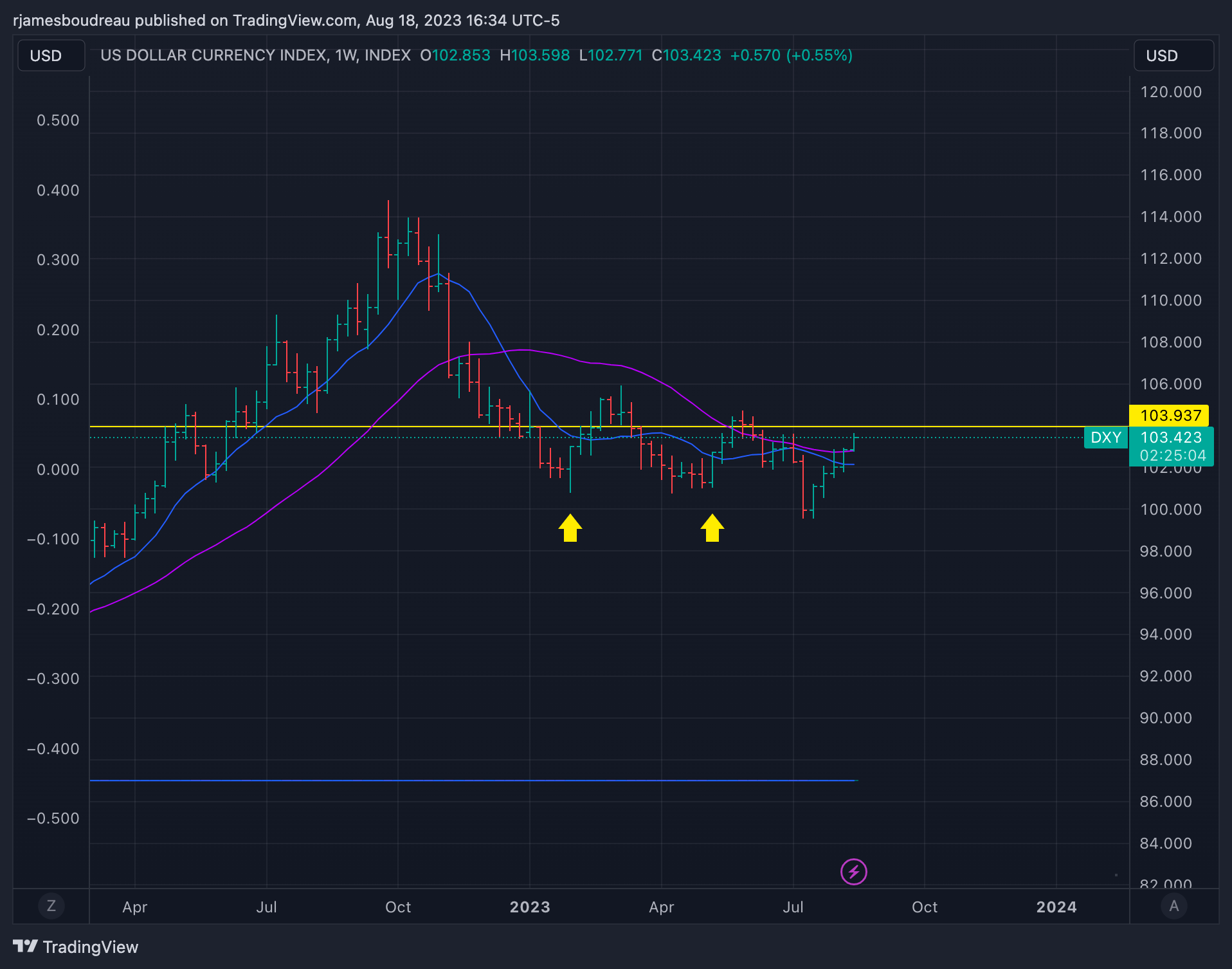 DXY keeps moving steadily higher. That $104 level will be a big test. A rest here is a high probability regardless of it is going to move higher or lower. It makes sense for both scenarios to just have a rest here.